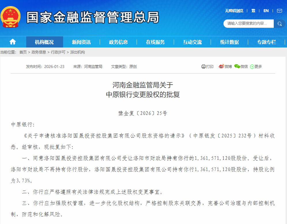 【大河财立方消息】1月23日消息,河南金融监管局批复,核准洛阳国晟投资控股集团有限公司股东资格,同意洛阳国晟受让洛阳市财政局持有中原银行的13.62亿股股份。