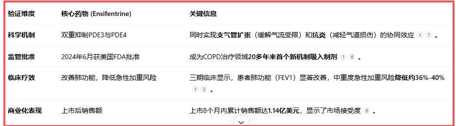 值得注意的是,PDE3/4作为一个治疗慢性阻塞性肺病(COPD)的靶点,能同时实现支气管扩张和抗炎的效果,直击COPD的核心病理机制。且2024年,美国FDA批准了同类首款药物Ensifentrine,为该靶点的成药性提供了关键验证。