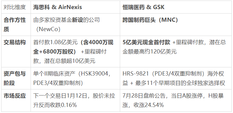 实际上2025年7月,恒瑞医药与葛兰素史克(GSK)也关于该靶点达成BD交易。只不过与海思科不同,恒瑞医药在与GSK的交易公告后,其A股和H股股价均出现了显著上涨。