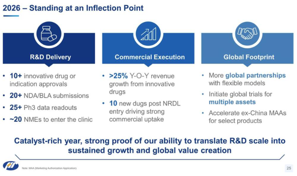 再结合公司2026年预计迎来 25+项 III 期数据读取、20+项 NDA/BLA 申报,以及预计 2026年目标创新药收入增长超 25%看,创新药收入成为驱动其增长的核心引擎。所以,若未来上述利好落地消息传来,资本市场可能会反复活跃。
