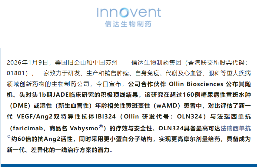 2026年1月9日,信达生物合作伙伴Ollin宣布,其自主研发的双抗IBI324(OLN324)在头对头罗氏开发的first in class眼科双抗Vabysmo的临床Ib期研究中取得积极顶线数据,显示更优疗效(在2025年9月将该产品的大中华区以外的全球权益授权给Ollin)。