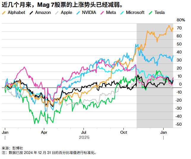 追踪该集团的指数于2025年10月29日收于纪录高位,此后七家成员公司中有五家股价下跌,跑输标普500指数。在此期间,谷歌股价飙升近20%,亚马逊公司也录得上涨,这两只股票是仅有的赢家。