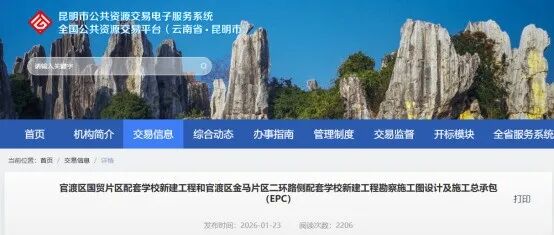 日前,云南省公共资源交易信息网发布《官渡区国贸片区配套学校新建工程和官渡区金马片区二环路侧配套学校新建工程勘察施工图设计及施工总承包(EPC)》招标计划。根据计划,项目总投资金额22373.47万元。