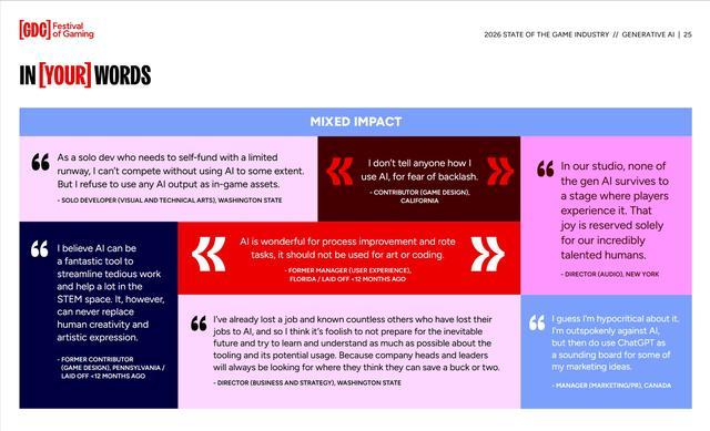 IT之家 1 月 30 日消息,PC Gamer 今日报道,根据游戏开发者大会(GDC)最新发布的《2026 游戏行业现状》调查报告,超过半数的游戏开发者认为,生成式 AI 对游戏行业产生了负面影响,这一比例较两年前大幅上升。