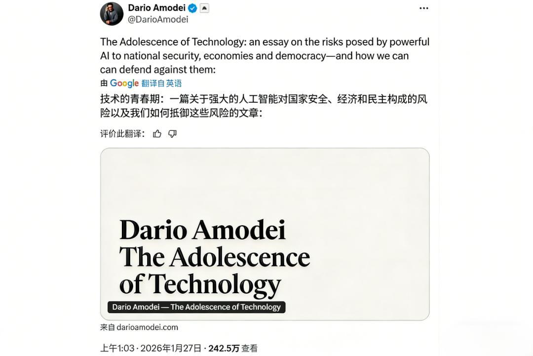 2026年1月,Anthropic CEO达里奥·阿莫迪(Dario Amodei)发布两万字长文《技术的青春期》,提出2027年,可能是AI的成年礼,也是人类社会首次面临系统性断裂的窗口期。