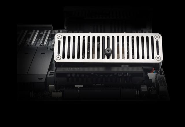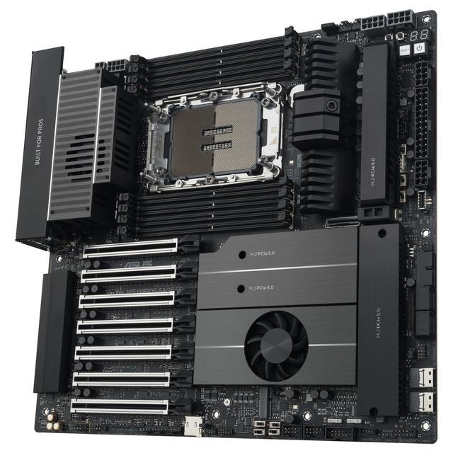 这一型号采用 12"×13" 的 SSI-EEB 板型,配备 16+2+2+1+2 相供电,拥有 7 条物理全长的 PCIe 5.0 插槽,搭载基于信骅 AST2600 芯片的 BMC 方案;其供电元件配备铝挤散热片,左侧内置散热风扇、右侧支持 AngleBoost 风扇套件;芯片组和 M.2 盘位拥有主动散热。