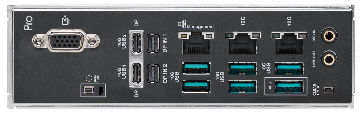 Pro WS W890E-SAGE SE 后部提供 1 个源自 AST2600 的 VGA 接口、2 个 USB-C 40Gbps、2 个 Mini DisplayPort in 输出、6 个 USB-A 10Gbps;板内则包含 1 组 USB-C 20Gbps 接针、1 组 USB 5Gbps 一分二接针、2 组 USB 480Mbps 一分二接针。