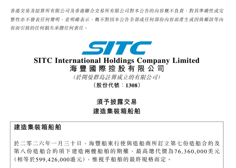 此次增订的2艘船舶,单船价格与之前保持一致,总价为7,636万美元。回顾整个订单,海丰国际最初于2023年8月宣布在黄海造船订造4艘同型船,合同总价值1.527亿美元。随后,公司分别于2025年10月31日和2026年1月30日(本次)各行使一次选择权,增订两艘。