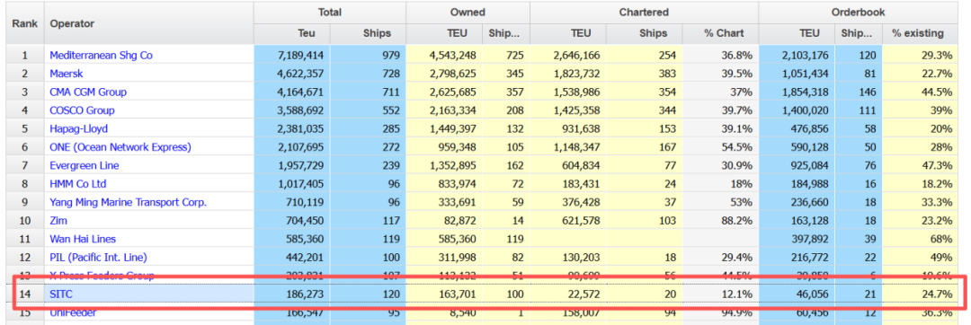 据Alphaliner最新数据显示,海丰国际共运营120艘集装箱船舶。其中自有集装箱船舶100艘。截止到2025年06月30日,海丰国际在全球班轮公司百强中排名第14位,运力为186,273TEU。