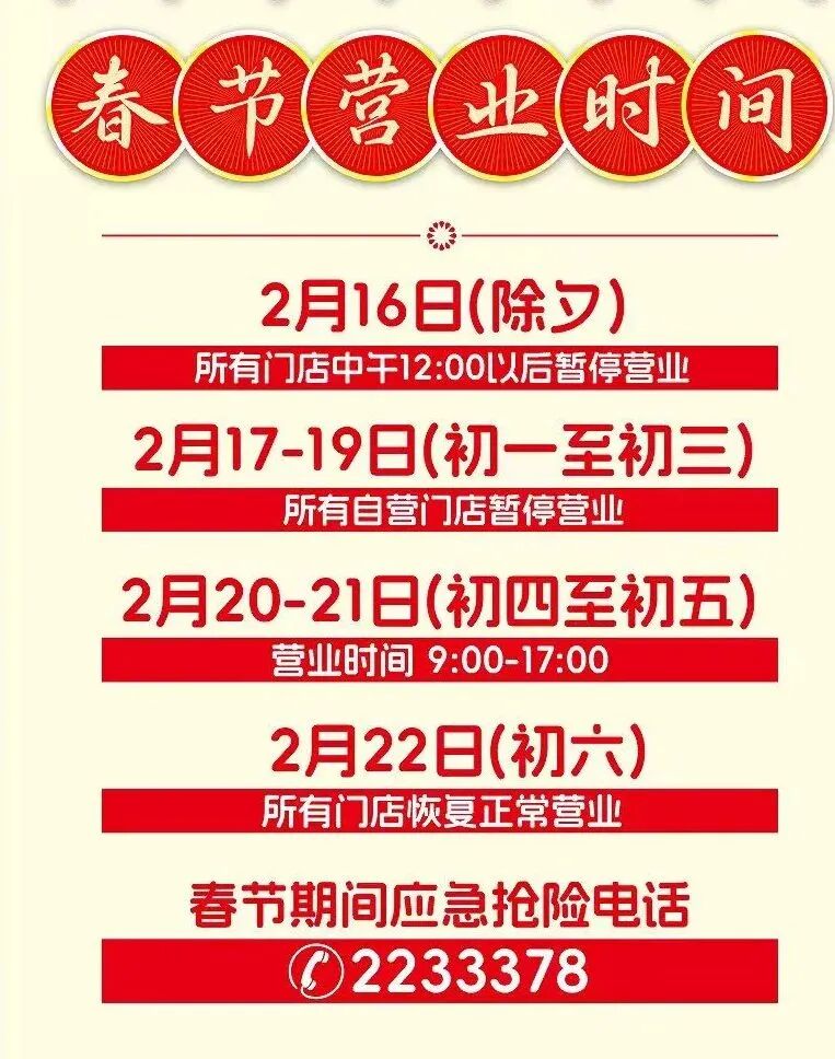 公布春节期间暂停营业时间。