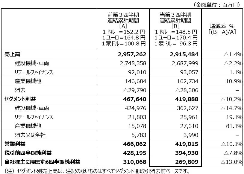报告期内,小松累计净销售额为29,154.84亿日元,较上年同期下降1.4%。营业利润为4,190.15亿日元,同比下降10.1%。归属于母公司股东的季度净利润为2,698.09亿日元,同比下降13.0%。