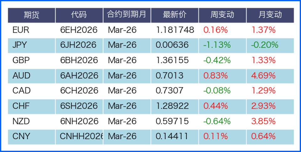 上周美元指数震荡上行,周线累涨0.54%。周初受美联储主席提名人沃什相关消息支撑走强,后因美国劳动力市场数据疲软承压。沃什的鹰派过往与近期降息主张,叠加缩表观点,初期支撑美元;但后续公布的美国初请失业金人数超预期、职位空缺数走低,加剧就业降温担忧。同时,由于美联储官员公开表态偏谨慎,市场对年内降息预期升温,焦点转向推迟公布的1月非农就业报告,预期该数据将成为美联储政策路径的关键催化剂。