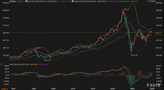 汇通财经APP讯——周一(2月9日),现货黄金在经历了上周五的强势上涨后,日内走势呈现高位盘整,欧市早盘一度站稳5000美元/盎司心理关口上方,但随后涨幅有所收窄。本文将结合最新的市场动态与4小时图技术结构,分析金价在关键美国经济数据公布前的多空逻辑,并对短期走势进行展望。
