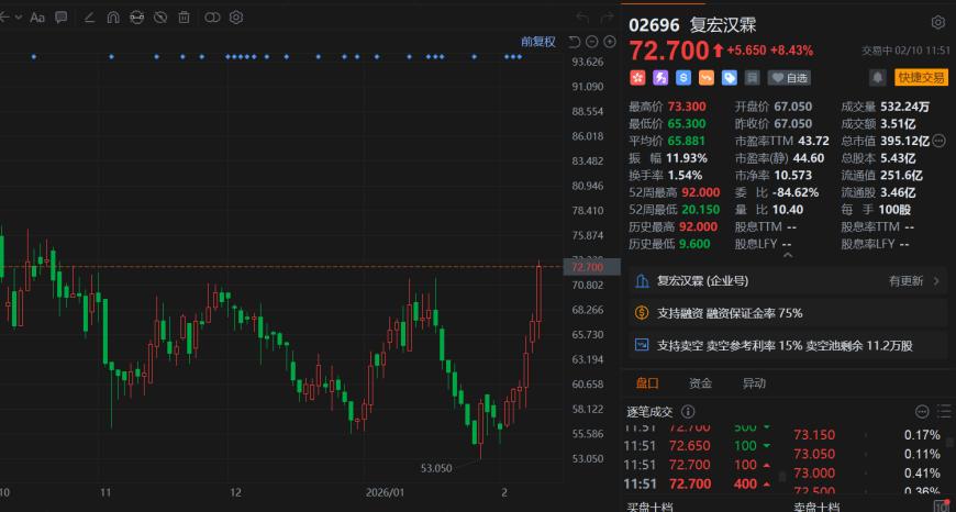 2月10日,复宏汉霖(2696.HK)再度拉升涨超8%,6日连涨高达30%,并且走出反转行情,现报72.7港元,总市值396亿港元。