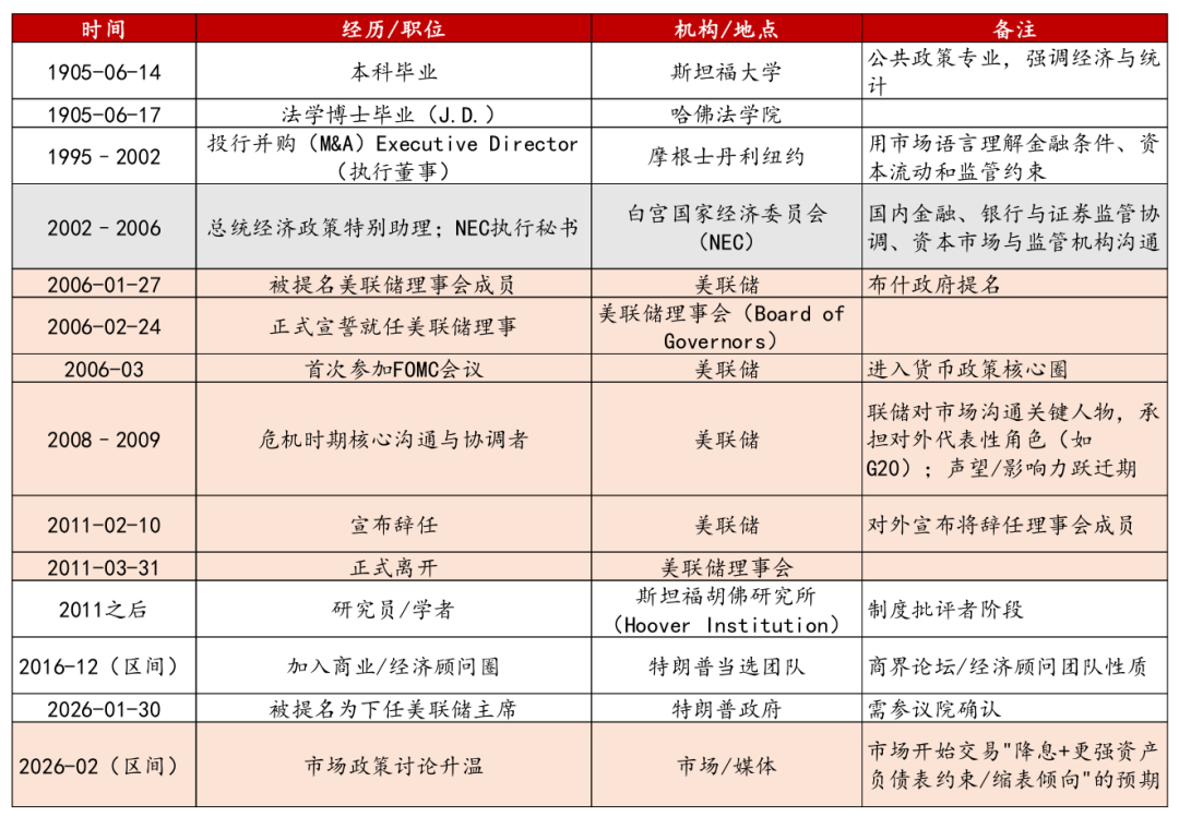 总体来看,沃什的履历可以概括为——其用华尔街的任职资历、与金融市场协同的语言进入白宫,再用白宫的政策协调能力进入美联储。