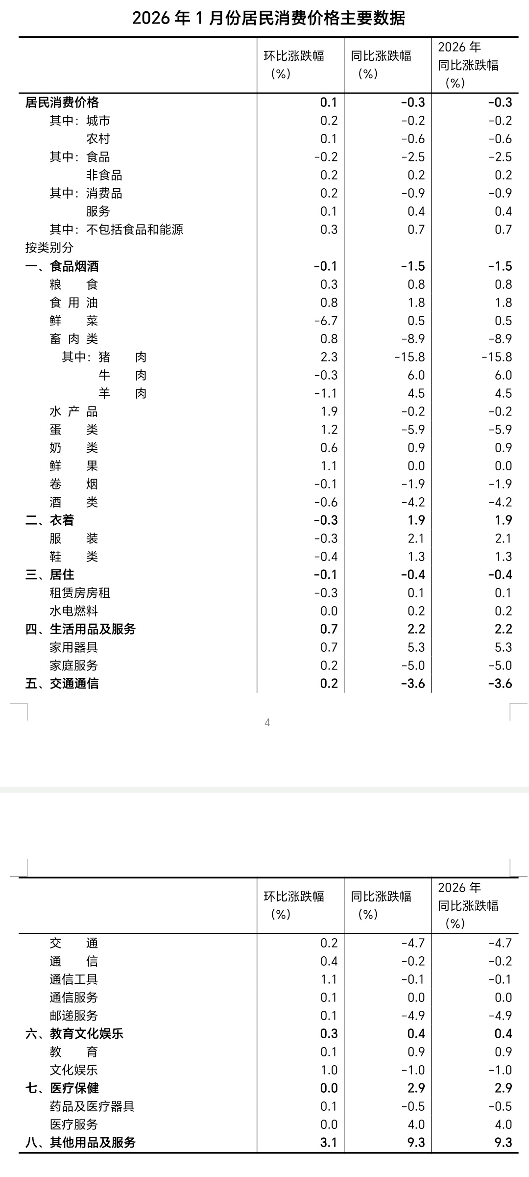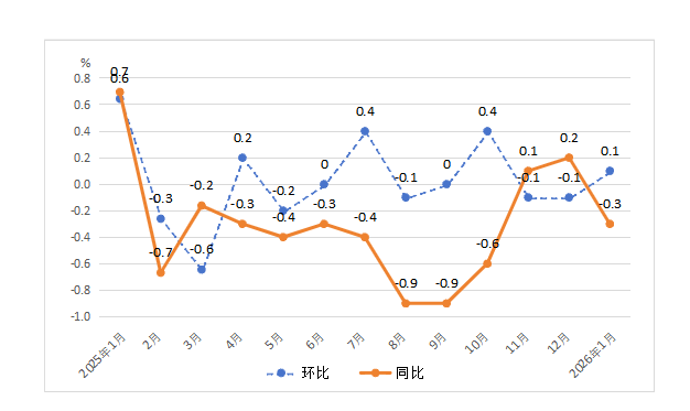2月12日,国家统计局四川调查总队发布数据显示,2026年1月份,四川居民消费价格指数(CPI)同比下降0.3%,与上月相比由涨转降;环比上涨0.1%,与上月相比由降转涨,呈现温和上行的趋势。