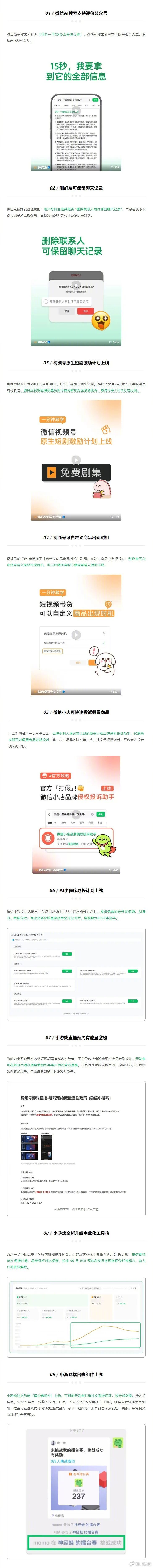 2月10日,微信公开课公众号公布微信1月九大功能更新,包括删好友可保留聊天记录、微信AI搜索支持评价公众号等,具体如下: