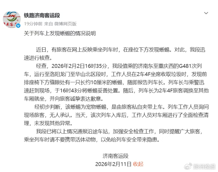 2月11日,铁路济南客运段发布关于列车上发现蜥蜴的情况说明:系旅客私自夹带上车,无人承认。