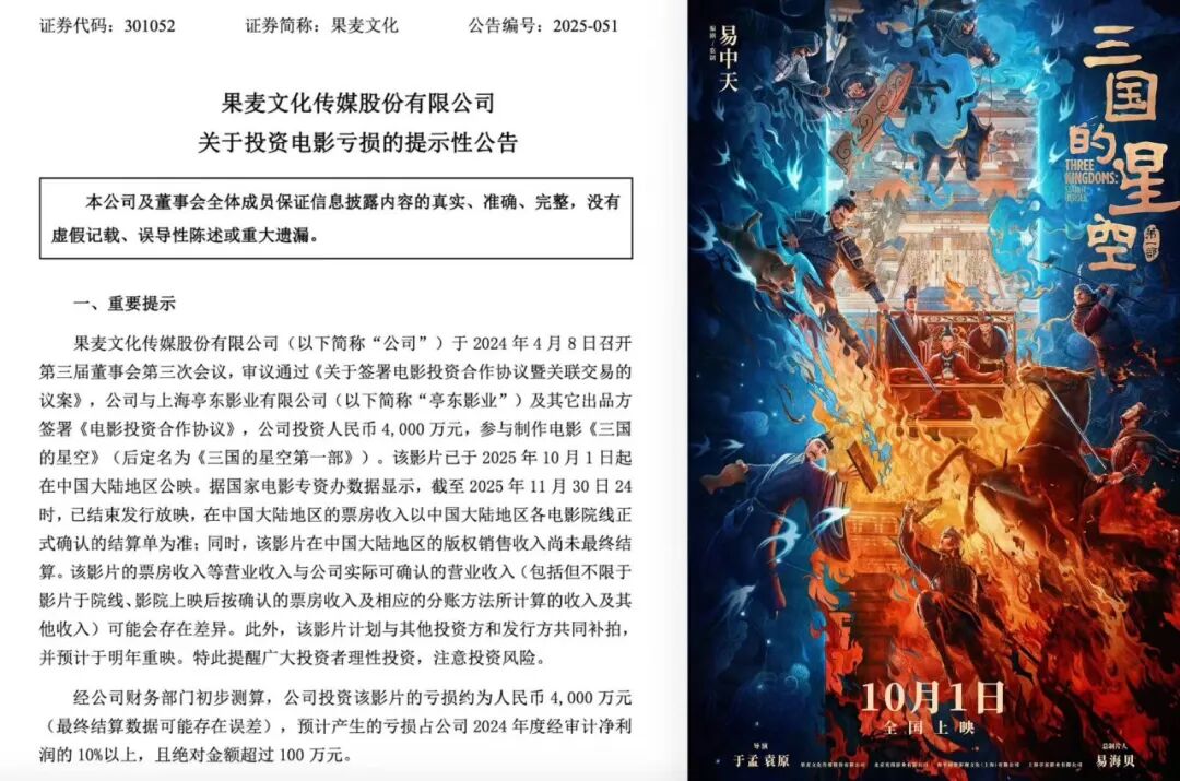 果麦文化曾参与出品了韩寒的四部电影。《四海》票房重创果麦文化后,果麦文化与亭东影业再牵手合作的电影是《三国的星空第一部》,结果票房再次重创了果麦文化。2025年12月2日,果麦文化发布了关于投资电影亏损的提示性公告,初步测算投资该影片的亏损约为人民币4000 万。