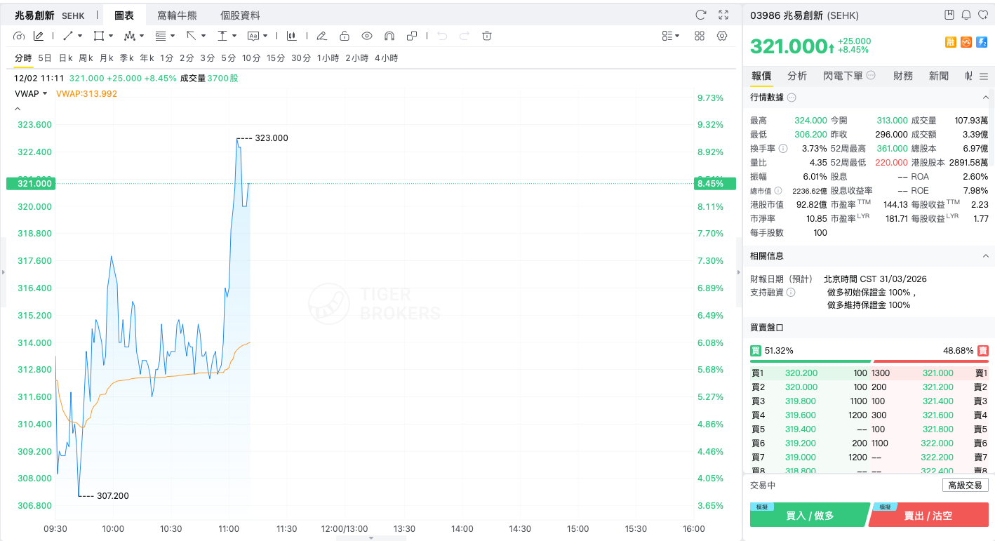 2月12日,兆易创新涨超8%,截至发稿,涨8.45%,报321港元,成交额3.39亿港元。