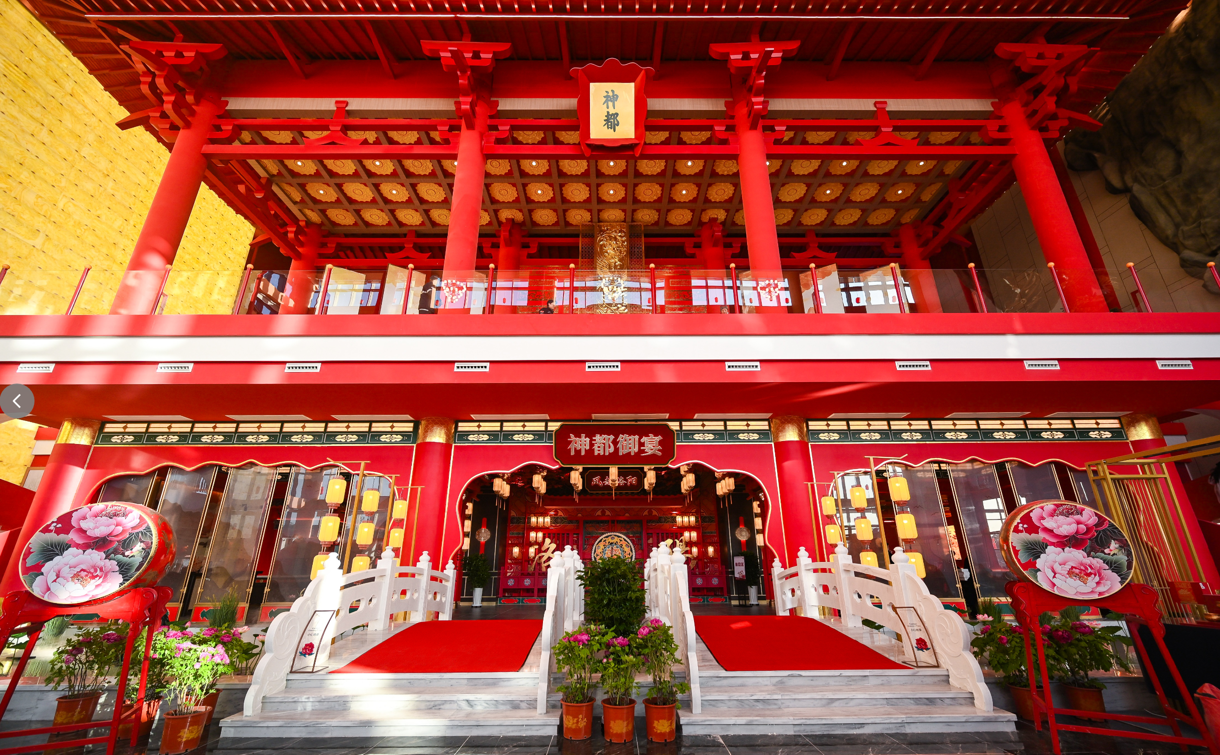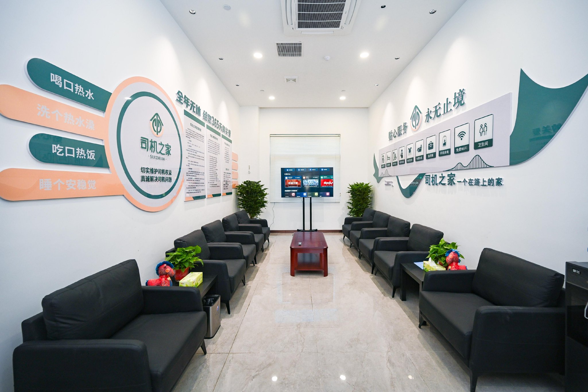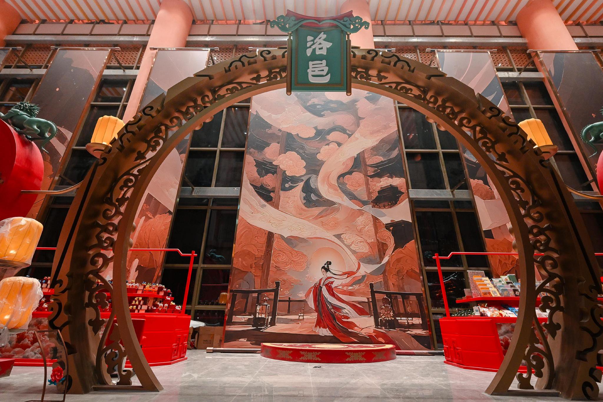 综合楼内一步一景。中央大殿复刻朝堂氛围,顶部七彩祥云层叠,光影交织满溢祥瑞,唐三彩与牡丹文化交相辉映,千年风雅流转于飞檐斗拱间。“龙椅卡位”汉服打卡让游客体验君临天下;司机之家淋浴、洗衣等设备一应俱全,服务细节尽显人文关怀;母婴室以牡丹主题软装打造,设置婴儿护理区,配备婴儿护理台、温奶器、净化器及应急母婴用品;“美食城”汇聚朴大叔、茶百道、库迪咖啡、道口烧鸡、绝味鸭脖、烩面、牛肉汤等地方特色美食;伴手礼专区涵盖牡丹文创、偃师银条等特产,让司乘“舌尖品洛阳,指尖带文化”。