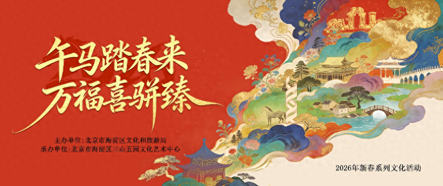 玩法:①限量福袋免费领,不用集赞,凭缘分解锁马年第一份惊喜!②关注活动小红书官方账号“2026年新春系列文化活动”,获取寻“马”线索,到场馆内按规则参与线索寻找活动,即有机会获得“金马福袋”。③现场拍摄活动立牌并参与小红书话题#三山五园文化艺术中心寻金马或#“午马踏春来,万福喜骈臻”——2026年新春系列文化活动 发布图文,还有机会领取新春限定福包。④现场还有财神NPC巡游、昆曲杂技展演,好玩又好拍!
