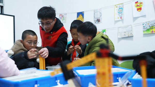 西北工业大学大学生志愿者带领孩子们制作航模。(西北工业大学供图)严冬寒 学堂暖