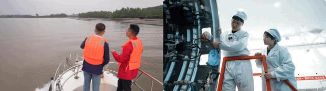 记者徐新晨与水利工程师出航已完成的平陆运河航道(左)