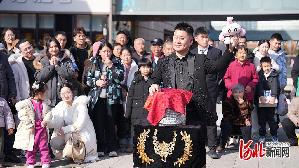 活动现场,来自省内的多位艺术名家轮番登台,带来歌曲、魔术、戏曲、器乐、杂技等多种形式的精彩节目。河北省音乐金钟奖金奖获得者李彩霞与银奖获得者张福堂联袂献上歌曲《欢乐中国年》,嘹亮的歌声萦绕广场。河北省心连心艺术团演员李悦带来的魔术《魔幻时刻》,赢得观众阵阵掌声。河北省河北梆子剧院一级演员、中国戏剧梅花奖获得者邱瑞德演唱的《大登殿》选段,字正腔圆、韵味悠长,令戏迷大呼过瘾。器乐重奏《梦里水乡》《青花瓷》由古筝、琵琶、二胡三位青年演奏家联袂呈现,仿佛将观众带入一幅江南水墨画中。