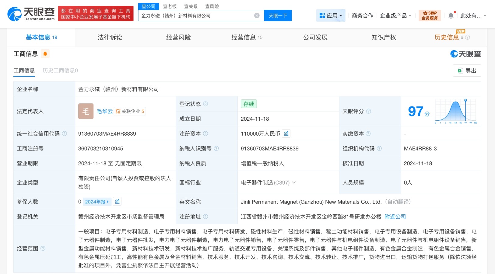 南方财经2月13日电,天眼查App显示,近日,金力永磁(赣州)新材料有限公司发生工商变更,注册资本由1亿人民币增至11亿人民币,增幅1000%。该公司成立于2024年11月,法定代表人为毛华云,经营范围含电子专用材料制造、电子专用材料销售、电子专用材料研发、磁性材料生产、磁性材料销售、稀土功能材料销售、电子专用设备制造等。股东信息显示,该公司由金力永磁(300748)全资持股。