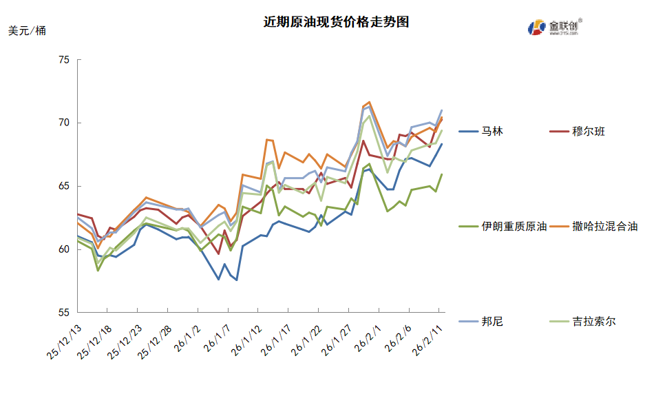 本周,国际原油现货均价环比上涨。中东原油市场方面,沙特下调3月销往亚洲的阿拉伯轻质原油官方售价至与迪拜/阿曼均价持平的水平,创逾五年低点,为沙特连续第四个月下调官价。此举表明,在供应过剩担忧继续令全球石油市场承压之际,沙特方面愈发谨慎。沙特3月销往亚洲的其他较重质原油的官价被下调0.40美元/桶,而较轻质原油官价则被上调0.20美元/桶。沙特还下调了3月销往美国、西北欧和地中海地区的所有品级原油官价。卡塔尔能源公司招标销售各50万桶4月装脱臭凝析油和低硫凝析油船货,该标书于2月11日截标,投标者递价有效期至2月12日。本次招标时间“较往年同期提前”,主要是为了避开2月10—12日在伦敦举办的行业会议。亚太原油现货市场,印度石油公司与印度芒格洛尔石化炼制公司招标寻购4月原油船货。此前,美国总统特朗普宣布与印度总理莫迪达成贸易协议,其中包括停止从俄罗斯采购原油。美国银行印度和东盟经济学家Rahul Bajoria表示,印度与美国达成的停止购买俄罗斯石油的协议不太可能损害印度经济。考虑到印度每月约30%-35%的原油供应来自俄罗斯,替代这部分供应将需要时间,不过远期合约已经显着减少。印度外交部发言人5日表示,若具备商业可行性,印度愿意从委内瑞拉等国采购原油。越南PV石油公司招标销售30万桶4月25-29日装Chim Sao原油船货,该标书于2月9日截标,PV石油公司已经通过标书形式售出两船各30万桶分别于4月5-11日和4月20-26日装SV-DN原油船货,售价为即期布伦特+3.00美元/桶左右。