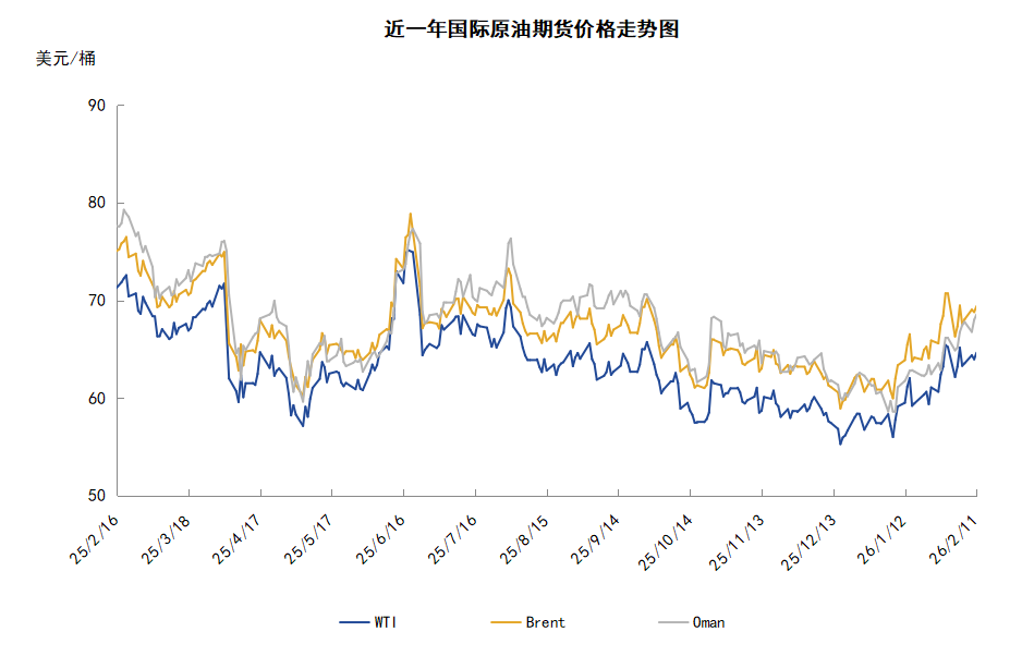 本周(2.5-2.11),国际原油价格整体呈现区间震荡的走势,周度均价环比下跌。WTI均价63.96美元/桶,较前一周下跌0.27美元/桶,或-0.41%。周内,中东地缘局势的不确定性以及投资者对美伊谈判持观望态度仍是影响周内油价走势的关键因素。