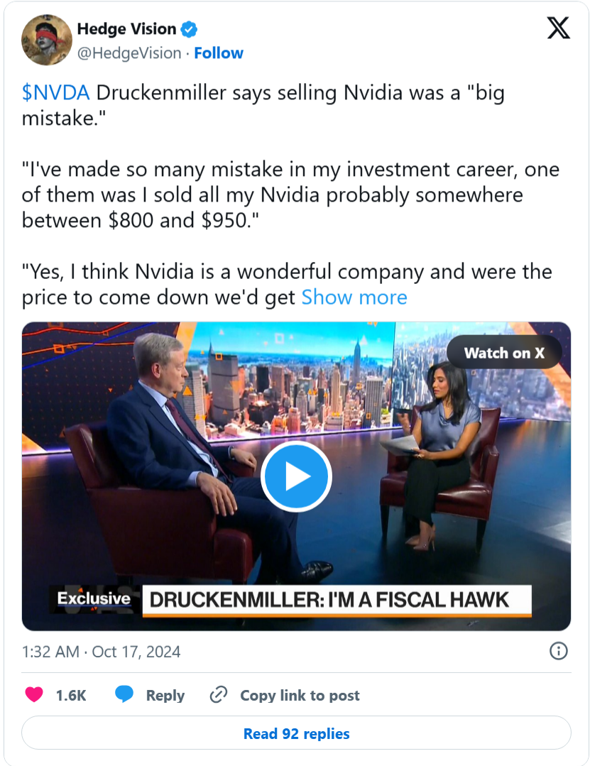 In fact, American billionaire investor Stanley Druckenmiller admitted in a fall 2024 Bloomberg interview that selling almost all of his Nvidia stock too early — for somewhere between $800 and $950 (pre-stock split) — was “a big mistake,” and that he was “licking my wounds from a bad sale there” and looking to buy in again if the price dropped.