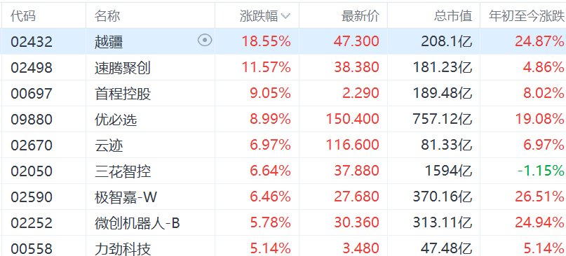 2月20日,港股市场机器人概念股集体走强,其中,越疆涨超18%,速腾聚创涨超11%,首程控股涨9%,优必选涨近9%,云迹、三花智控、极智嘉-W涨超6%,微创机器人-B、力劲科技涨超5%。