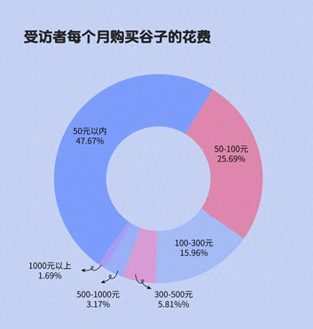 中国青年报·中青校媒近期面向以大学生为主的青年发起“吃谷”相关问卷调查,共回收有效问卷2327份。调查结果显示,40.65%受访者曾购买过谷子,购买渠道包括线上电商(80.02%)、线下实体店(68.82%)、漫展(23.04%)、线上跟团(24.31%)、二手交易平台(26.96%)、找国外代购(11.31%)等。受访者平均每月购买谷子的花费大都在300元以内,包括50元以内(47.67%)、50到100元(25.69%)、100到300元(15.96%)。也有一些受访者会花更多钱在“吃谷”上,如300元到500元(5.81%)、500元到1000元(3.17%)、1000元以上(1.69%)。
