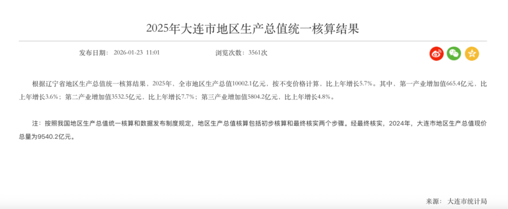 大连市2025年经济运行情况:实现地区生产总值10002.1亿元/图源:大连市统计局