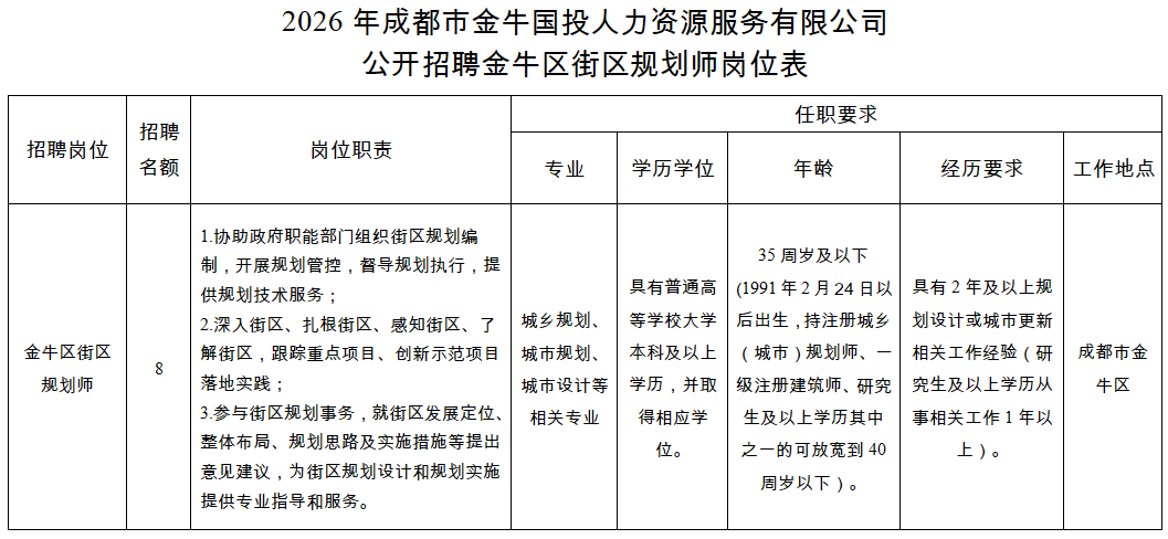 8. 符合《2026年成都市金牛国投人力资源服务有限公司公开招聘金牛区街区规划师岗位表》规定的条件(详见附件1)。