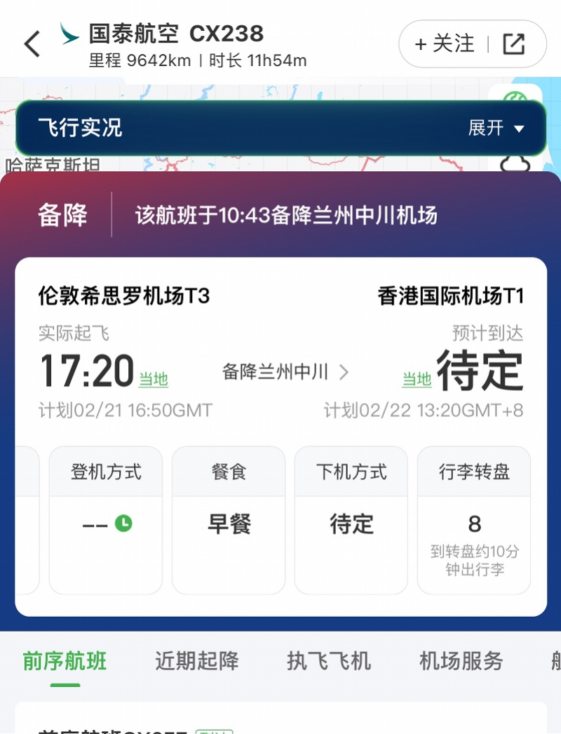 航旅纵横App显示,CX238航班在当地时间2月21日17时20分(中国香港时间2月22日凌晨1时20分)从英国伦敦希思罗机场起飞,计划于2月22日12时44分抵达香港国际机场,飞行时间为11小时54分钟。信息显示,该航班于2月22日10时43分备降兰州中川机场。