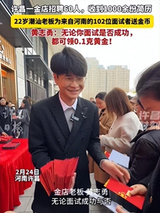2月24日,河南许昌一金店招聘60人,收到1000余份简历,22岁潮汕老板黄志勇为102位面试者送0.1克金币,“无论面试成功与否,我都给大家送一份小金币。”
