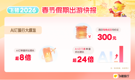 今年春节假期,让AI帮忙下单餐饮、订机酒、买电影票成为新“民俗”,其中AI预订旅行服务迎来大爆发。整个春节假期,飞猪AI订单量比节前增长了800%以上,简单实惠的AI订门票最受欢迎,订单量大增超24倍,峨眉山景区、黄山风景区、清明上河园是AI订门票的大热门。操作简单、方案合理,越来越多的高客单价服务也由AI来完成,这些AI订单中,机票平均每张成交价格超过700元、酒店平均每晚成交价格接近300元,杭州、上海、重庆、武汉、郑州等是AI订酒店的热门目的地。