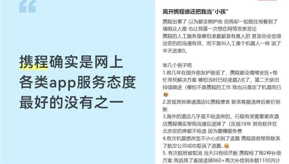 越来越多曾被“捞”过的人主动发声。“用过携程的人会觉得携程是一个不折不扣的天使”、“在国外,至少携程会管你”、“没了携程,谁凌晨4点会理我”。