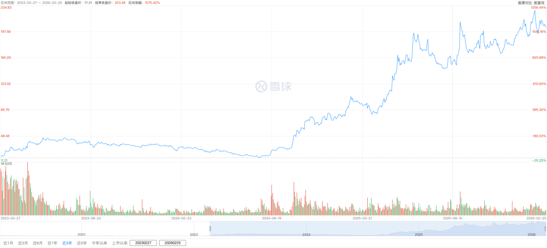拉长时间线来看,自2023年2月以来,截至20262月25日收盘,三年多时间,万辰集团股价涨幅超1000%截至2月25日收盘,万辰集团的总市值超380亿元。