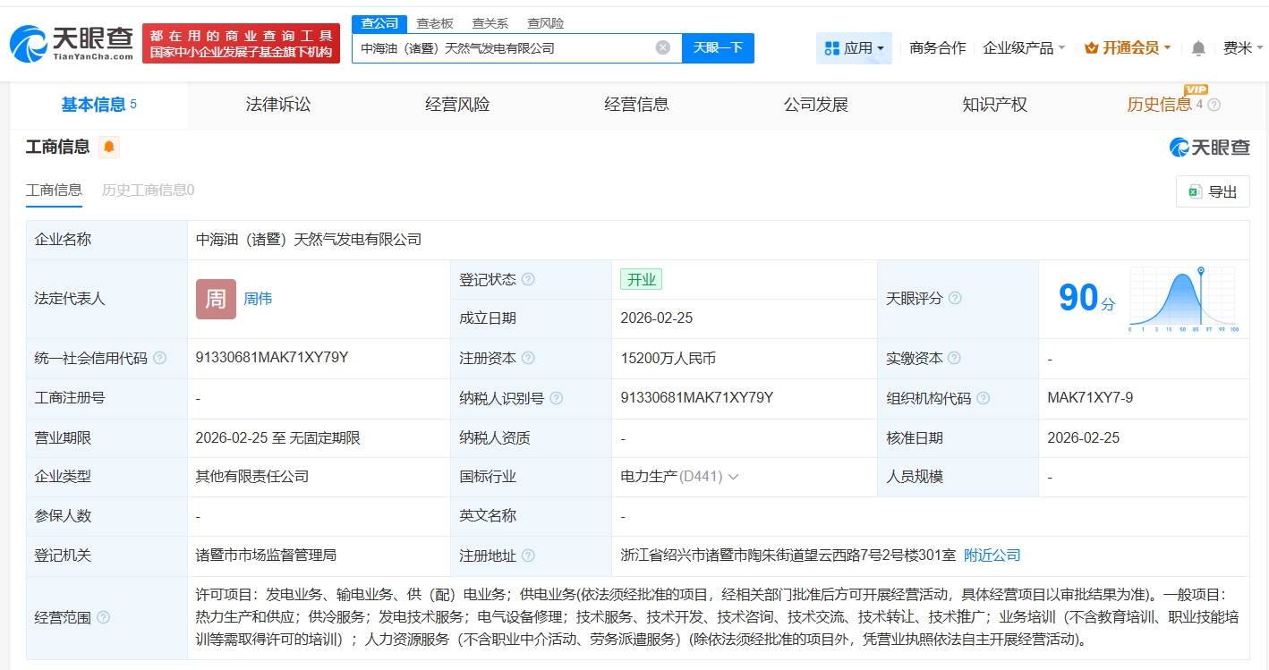 南方财经2月25日电,天眼查App显示,2月25日,中海油(诸暨)天然气发电有限公司成立,法定代表人为周伟,注册资本1.52亿人民币,经营范围包括热力生产和供应、供冷服务、发电技术服务等,由中海油电力投资有限公司全资持股。