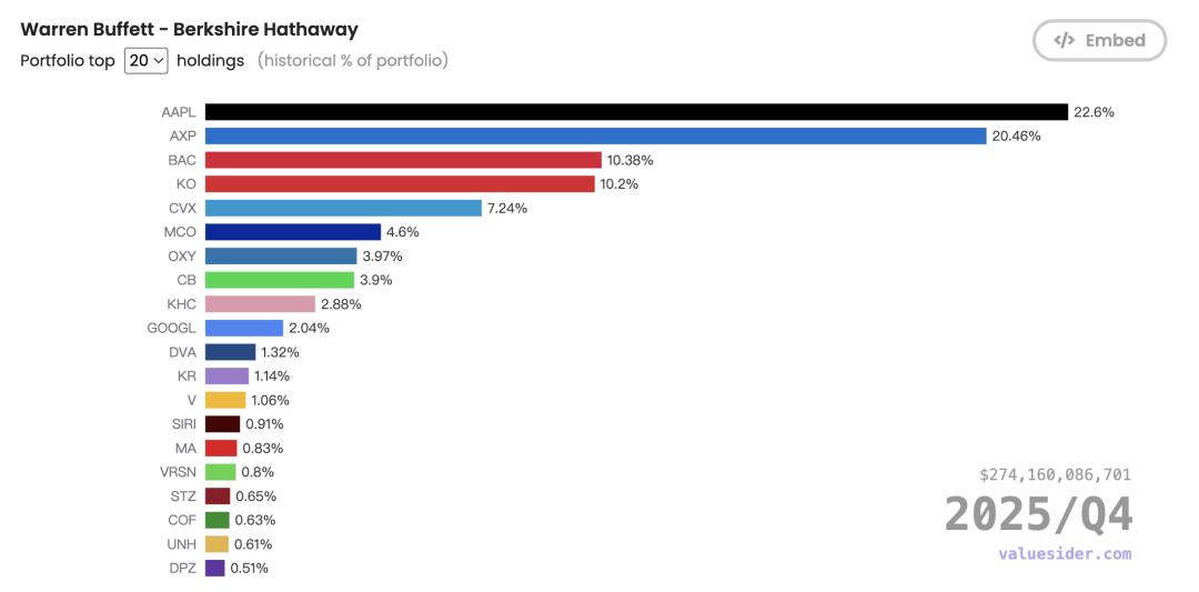 这是95岁的巴菲特在正式卸任CEO后留下的最后一份持仓成绩单。他于2026年初将CEO职位交棒给Greg Abel,而公司的现金储备在第三季度末已膨胀至创纪录的3816亿美元,因市场的高估值令巴菲特始终难觅合适的"象级"并购机会。