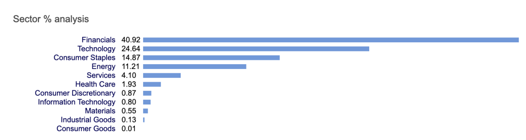 从行业分布来看,金融板块以40.92%的占比高居首位,科技板块以24.64%位列第二(主要由苹果贡献),消费必需品板块占14.87%(可口可乐为核心),能源板块占11.21%(雪佛龙与西方石油为主力),其余行业合计不足10%。