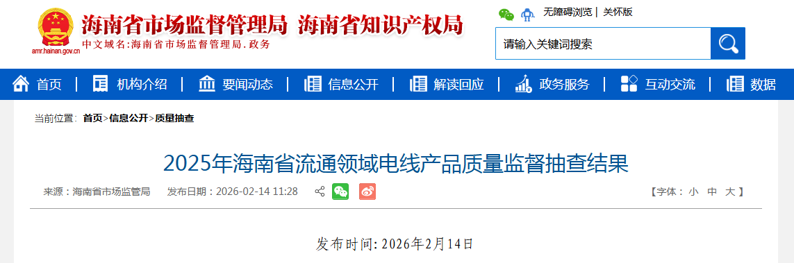 中国质量新闻网讯 据海南省市场监督管理局网站消息,2025年第4季度,海南省市场监督管理局对全省流通领域电线产品进行了监督抽查。本次抽查了27批次产品,经检验,不合格1批次。
