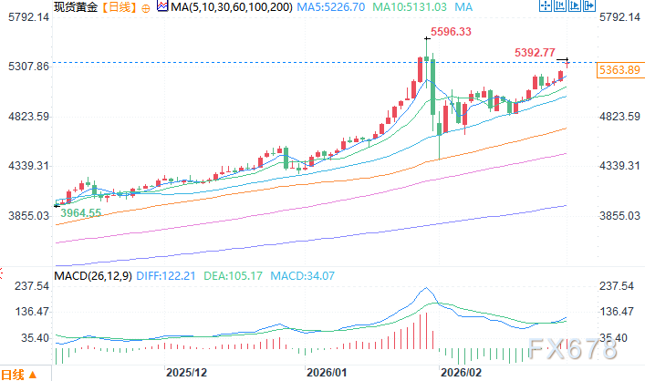 汇通财经APP讯——黄金从 5400 美元区域回落,该区域是自 1 月下旬以来的最高水平,周一的亚洲交易时段曾触及,不过它成功保持在 5300 美元的整数关口上方。目前黄金的交易价格高于 5300 美元的中位,交投于5350关口附近,当日上涨超过 1.0%。