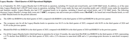 对于所有已运营至少18个月的华住旗下酒店,2025年第三季度的同店每间可用客房收入为250元,较2024年第三季度的262元下降了4.7%,其中同店平均房价下降了2.3%,同店入住率下降了2.1个百分点。
