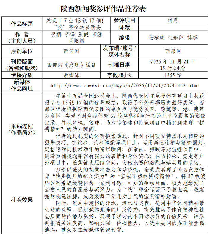 按照陕西省人力资源和社会保障厅、陕西省新闻工作者协会发【2026】40号《陕西省人力资源和社会保障厅 陕西省新闻工作者协会关于开展陕西新闻奖、陕西省优秀新闻工作者奖评选表彰的通知》要求,经由单位领导及编辑记者代表组成的评委会集体评议,拟推荐《发现丨7金13银17铜!“陕”耀全运展新姿》参评2025年度陕西新闻奖。现将作品推荐表进行公示(推荐表附后)。
