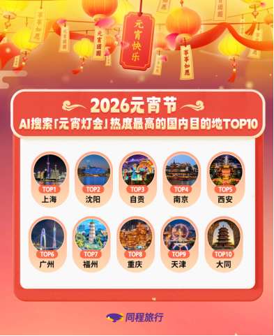 正月十五,各地丰富多彩的元宵灯会及猜灯谜活动,激发了节日出游热情。越来越多的消费者借助AI工具,获取定制化的元宵节出游方案。同程旅行数据显示,截至3月2日16点,使用同程旅行旗下旅行智能体DeepTrip搜索元宵节“灯会”的热度较上周同期增长超过40%。用户的AI搜索中,上海、沈阳、自贡、南京、西安、广州、福州、重庆、天津、大同等目的地的元宵灯会关注度最高。